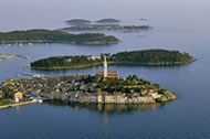 Rovinj: With its fortified double walls and three Town Gates from the early Middle Ages, Rovinj presents an example of urban architecture of the Mediterranean type. The church of St. Euphemia, with the statue of the patron saint of Rovinj standing on its 60m high bell tower, dominates the town. All the Rovinj coast and the surrounding 22 islands and islets are a protected natural heritage. Besides all the beauties of its hidden corners, this green paradise provides everything a modern tourist may wish for.
